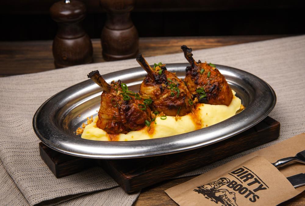 Сочная голень в пряно-томатном маринаде, приготовленная по технологии су-вид. Подается с нежным картофельным пюре, луком фри и свежей зеленью.