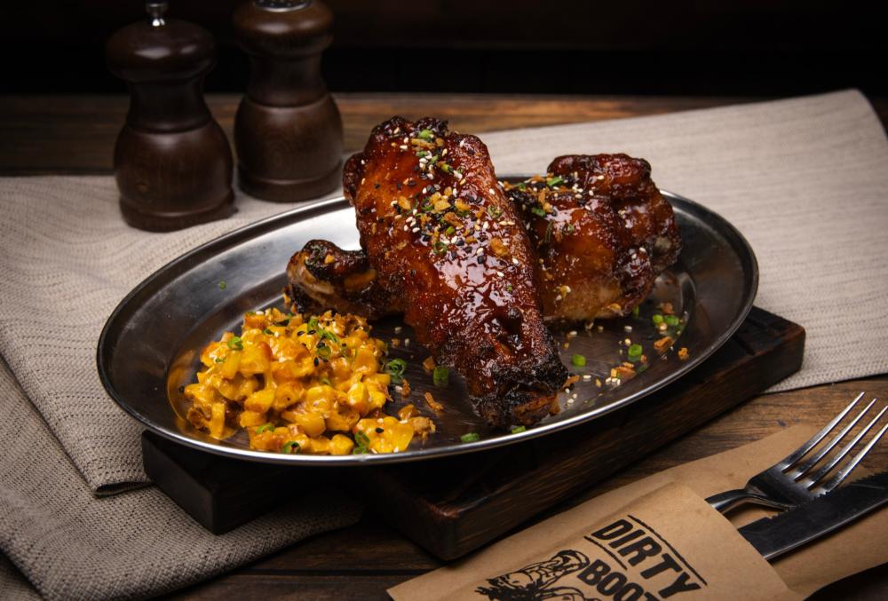 Запеченные крылья индейки в ароматном маринаде, покрытые сладко-пряной глазурью из меда и соуса BBQ. Подаются с кукурузой в сливочно-сырном соусе и посыпаются кунжутом и зеленью.